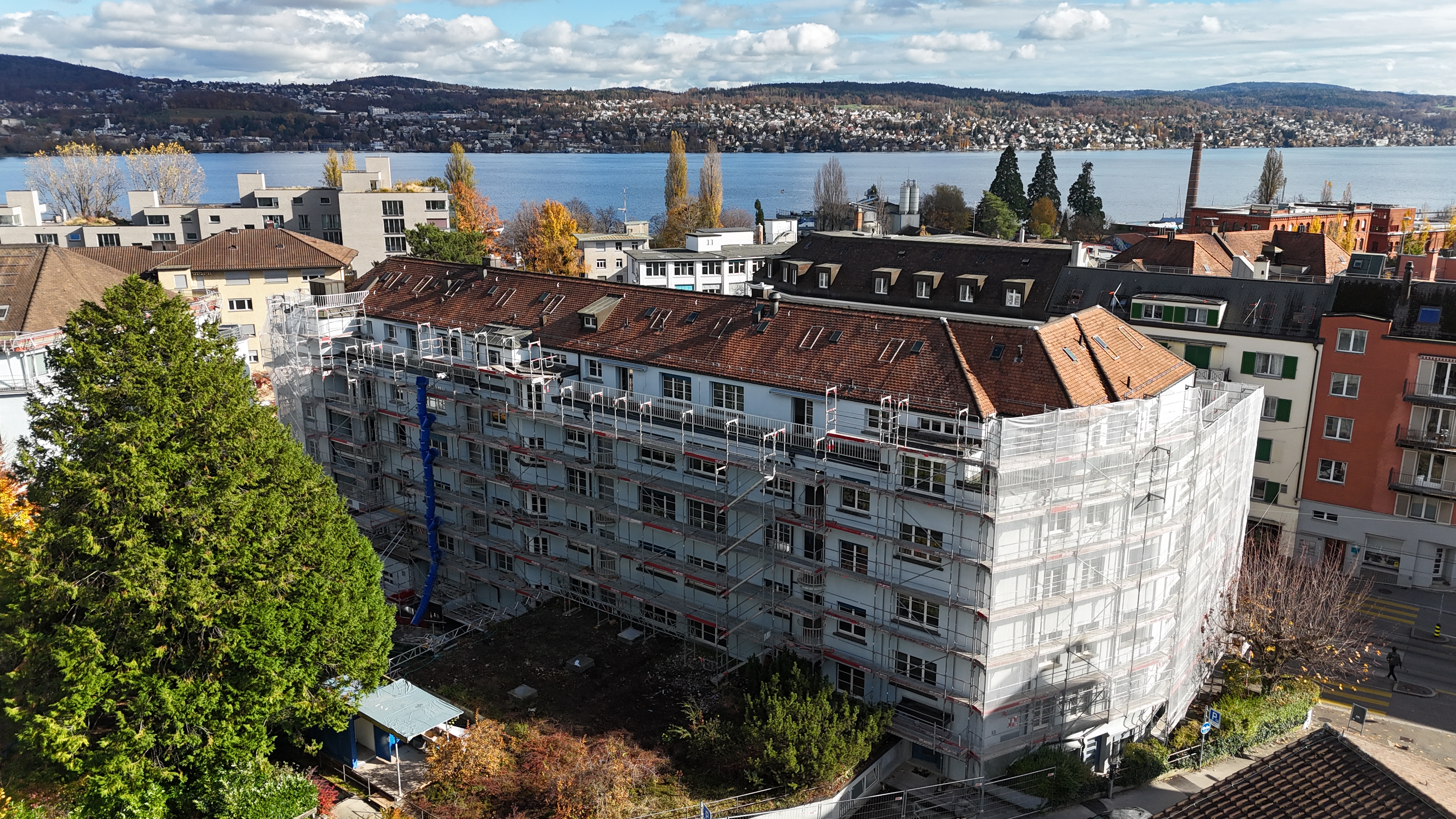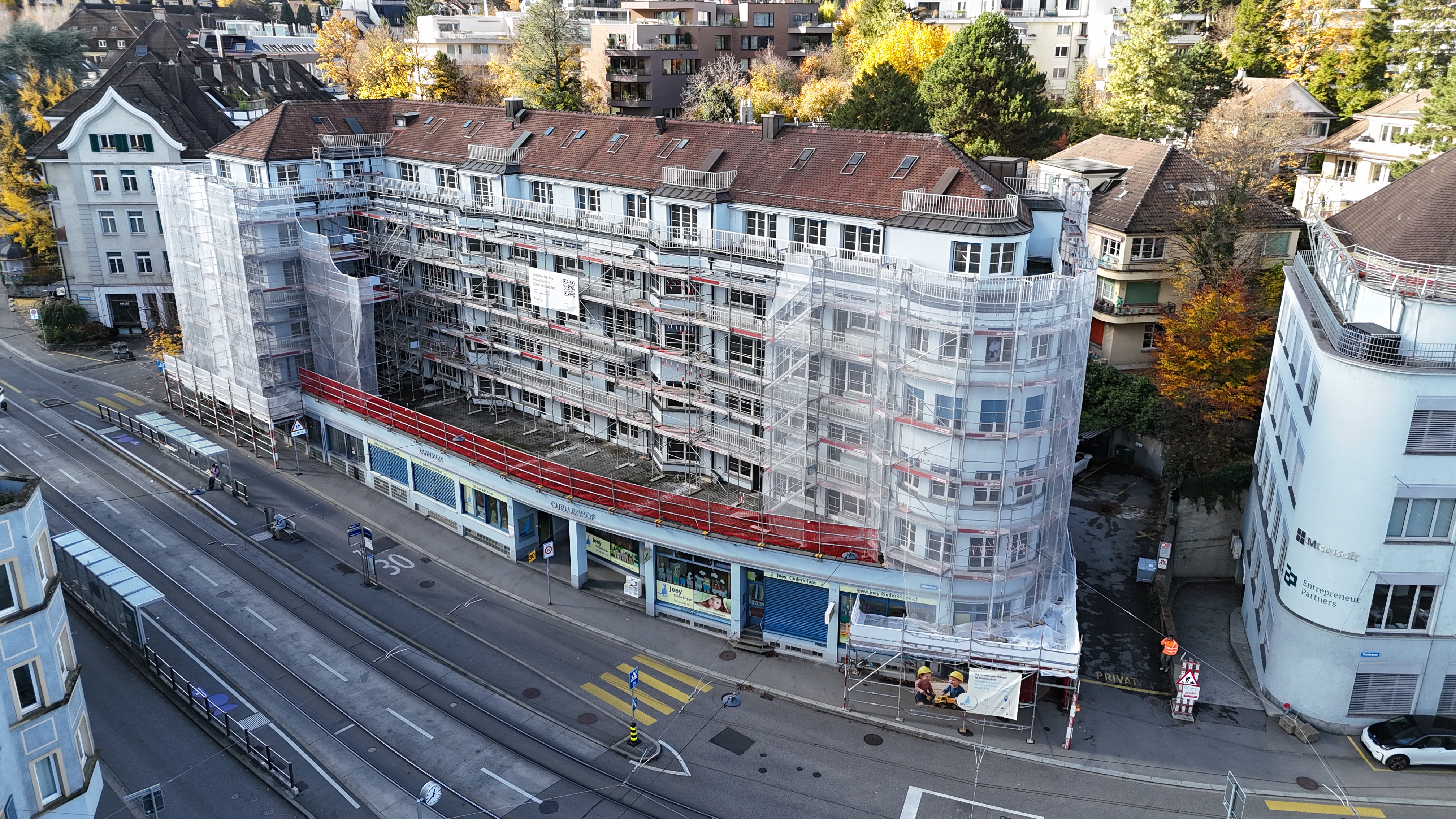 Das inventarisierte Gebäude wird umfassend erneuert und baulich wie technisch an heutige Anforderungen angepasst. Der Schutzstatus verlangt eine Sanierung in enger Abstimmung mit der Denkmalpflege. Die Gebäudehülle wird instand gesetzt, das Dach erneuert sowie Fenster und Wetterschenkel ersetzt. Balkone und Aussengeländer werden überarbeitet. Im Inneren erfolgt ein Rückbau bis auf den Rohbau, gefolgt vom vollständigen Neuaufbau aller Boden-, Wand- und Deckenaufbauten. Die Grundrisse werden neu organisiert, insbesondere mit der Neugestaltung von Küche und Nasszellen. Eine neue Aufzugsanlage verbessert die Erschliessung, und das Erdgeschoss wird für die Nutzung als Kita instand gesetzt. Zusätzlich werden Innenabdichtungen gemäss Denkmalschutzvorgaben ausgeführt. Die Aussenräume und der Hof werden neugestaltet und funktional aufgewertet.