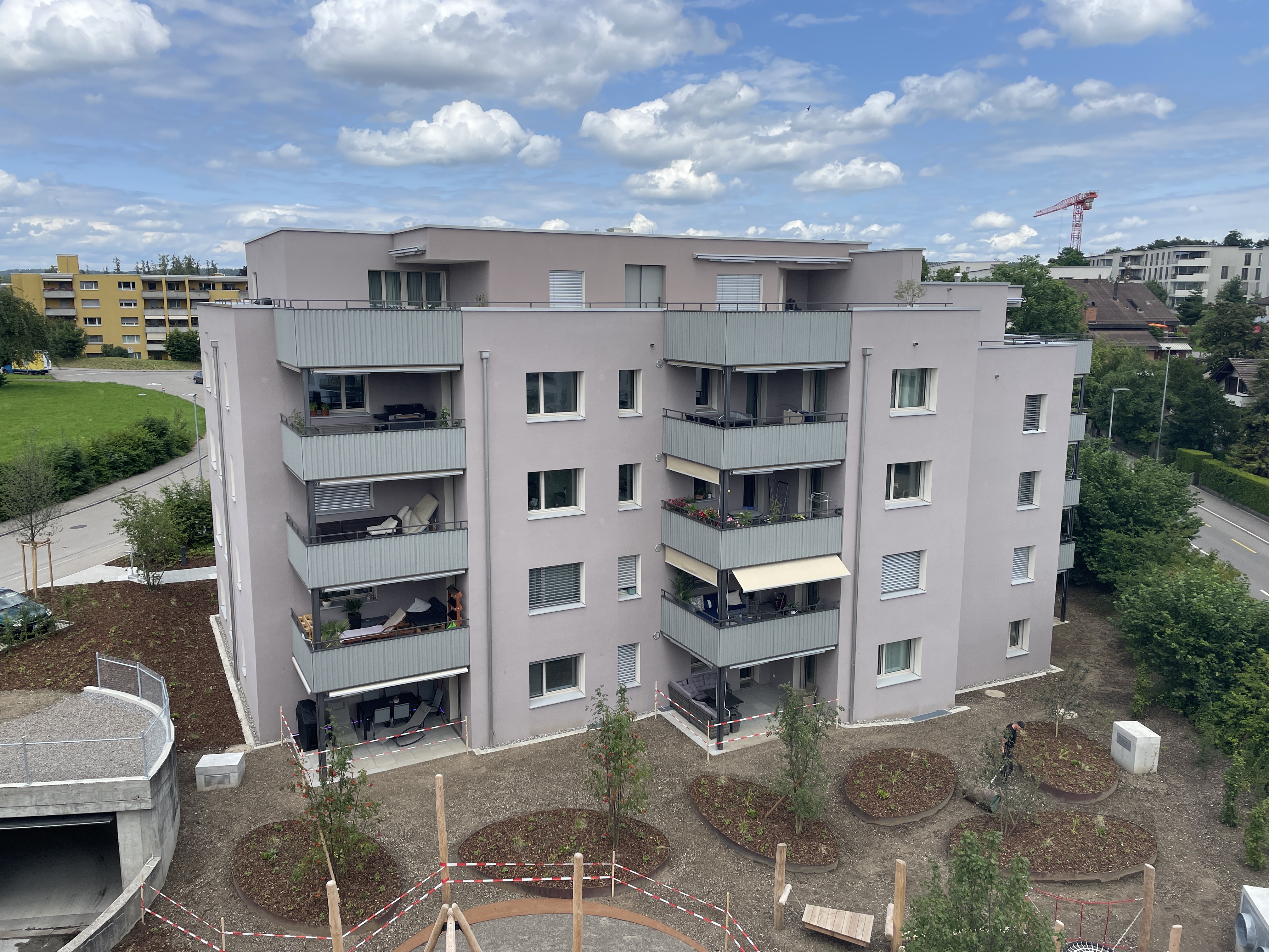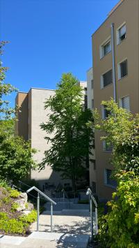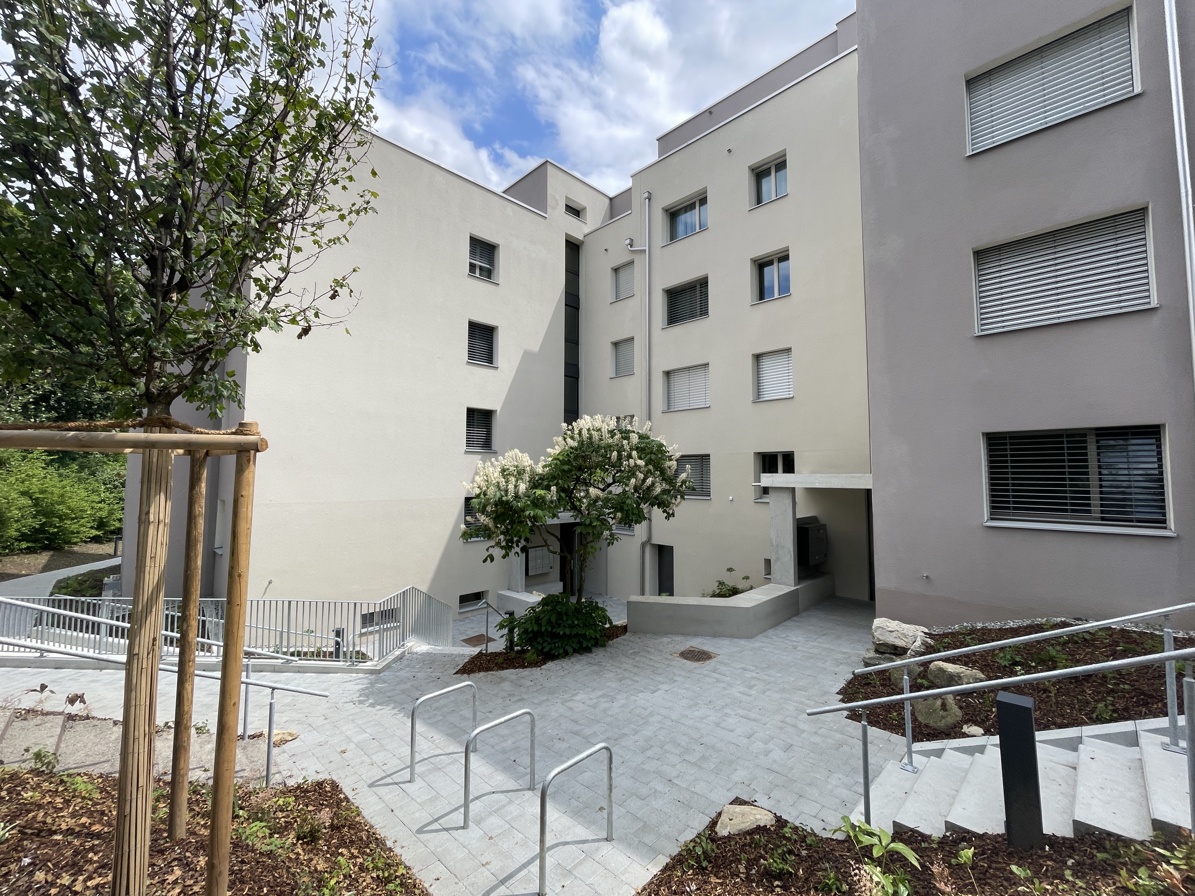 Die beiden Mehrfamilienhäuser mit 45 Wohnungen wurden 1986 erstellt. Die Erneuerung der Liegenschaft, im bewohnten Zustand, umfasste nebst der Strangsanierung der Küchen und Nasszellen auch die Ertüchtigung der Gebäudehülle mittels neuer Fassaden- und Flachdachdämmung sowie Fensterersatz. Durch neu erstellte, grosse Balkone wurden die Wohnungen aufgewertet. Die neu erstellte Umgebung inkl. grosse Spielplatzfläche, die Auffrischung der Treppenhäuser mit neu angeordneter Eingangssituation sowie Sanierung der Liftanlage wertet die Zugangssituation zu den Wohnungen zusätzlich auf. Ebenfalls wurde die Einstellhalle statisch und brandschutztechnisch ertüchtigt. Die Gebäudetechnik wurde falls notwendig auf den neusten Stand gebracht und die Liegenschaft für den Anschluss an das kommende Fernwärmenetz vorbereitet. Die Dächer wurden mit neuen PV-Anlagen versehen.